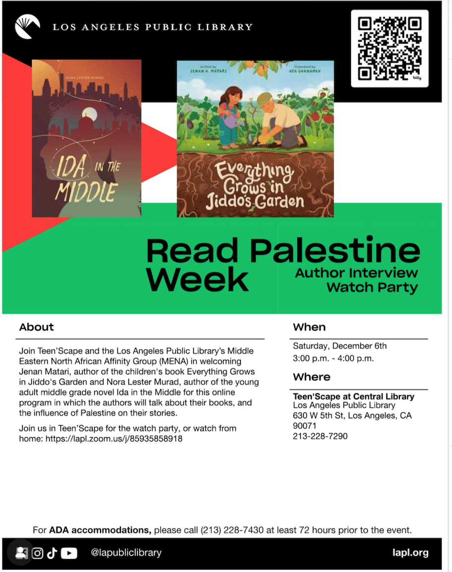 The event flyer states that the event is a virtual conversation — hosted by Teen’Scape, the young adult section of the Los Angeles Public Library’s Central Library location, and the library’s Middle Eastern North African Affinity Group — in which Murad and Matari “will talk about their books, and the influence of Palestine on their stories.” People would have been able to watch this talk at an in-person “watch party” at in the Teen’Scape area of the library, and remotely, over Zoom.