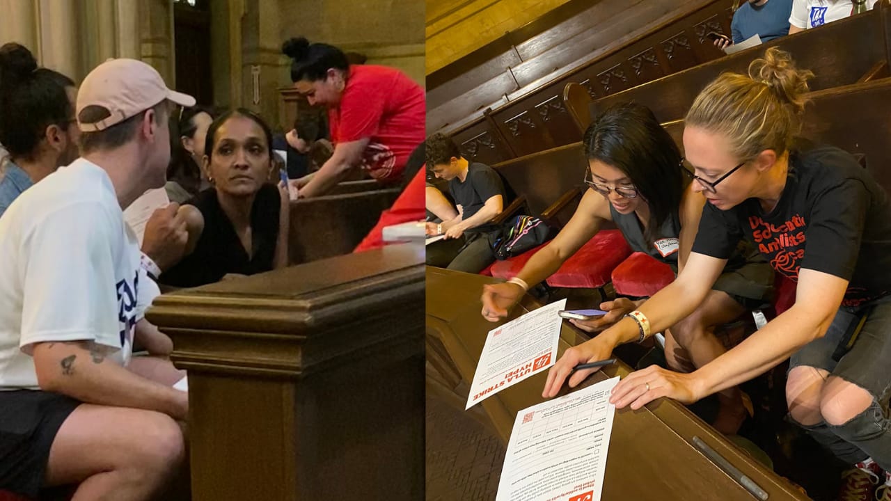 Nearly 500 DSA-LA members gathered to debate whether to jump into the mayor’s race with an endorsement, which entails sending members out to canvass, for either City Council member Nithya Raman or housing advocate Rae Huang. While the majority voted in favor of re-opening their endorsement process, the matter failed to the 2/3 threshold needed to pass. (Photo by Elizabeth Chou)