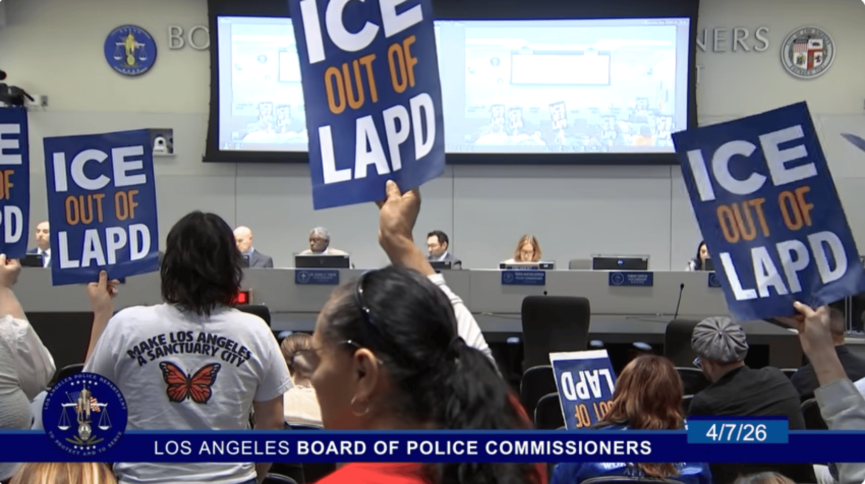 The LA Sanctuary Coalition turned out to a Board of Police Commissioners meeting on April 7, 2026 to urge commissioners to limit LAPD from responding to 911 calls from ICE and other federal immigration officials. (Screengrab of the April 7, 2026 Police Commission meeting)